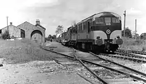 ![]() Train in Kingscourt station (1976). Goods shed to the left, former passenger building behind it | |