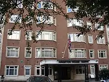 The Kingston House estate and Ennismore Gardens in Knightsbridge is a green, dual-character area within the western limits of the City of Westminster in London. The first-named is immediately south of Hyde Park, London taking up the park's semi-panorama row of 8 to 13 Princes Gate (demolished) and otherwise, as to more of its wings, set around the east of Princes Gate Garden including a terrace of houses №s 1 to 7 Bolney Gate. The second-named is a garden square of 59 tall creamy-white terraced houses and the approach road to Prince of Wales Gate, Hyde Park[lower-alpha 1] as well as the identical-size public, square green of the church that is since 1956 the Russian Orthodox Cathedral of the Dormition of the Mother of God and All Saints facing which green are its anomalous outlier row for a London garden square, №s 61 to 66.[lower-alpha 2] The relatively small, broad-fronted house set against the Consulate-used pairing at №s 61 to 62 is № 60 and as with the other 65 numbers of Ennismore Gardens is a listed building.