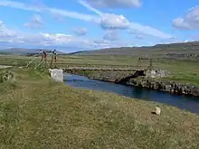 The upper river, closer to the glacier, is Kjarrá; the in-between is Örnólfsdalsá; the lower river, closer to the sea and "below the fence above Örnólfsdal," is Thervá (Icelandic: Þverá).[1][2]