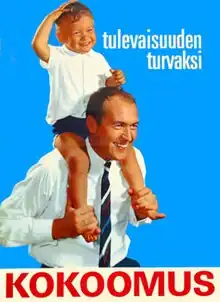 In 1951, the party changed its official name from the original Kansallinen Kokoomuspuolue to the current Kansallinen Kokoomus. The 1950s were also a time of ideological shifts, as the emphasis on individual liberty and free market reforms increased at the expense of social conservatism and maintenance of a strong government. A minor division in 1958 led to the formation of the Christian Democrats party. From 1966 to 1987, the party was in the opposition.[25] By criticizing Finnish communists and President Urho Kekkonen of the Centre Party, the party had lost the President's trust—and thus governments formed by the Centre Party and left-wing parties followed one another. A new guard emerged within the Kok in the 1970s that sought to improve relations with long-serving President Kekkonen. Their work was partially successful in the late 1970s.[26] However, even though the Kok supported Kekkonen for president in 1978 and became the second largest party in the country in the 1979 parliamentary election, a spot in the government continued to elude the Kok until the end of Kekkonen's time in office.[17][18][24]