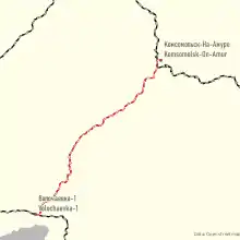 The Komsomolsk–Dezhnyovka railway line (Russian: Комсомольск-на-Амуре — Дежнёвка) is about 363 km of Far Eastern Railway within Russian Railways.[1] It connects Dezhnyovka station of Trans-Siberian Railway near Khabarovsk and Komsomolsk-on-Amur station of Baikal-Amur Mainline. The construction of this line began in 1935, and opened in 1940.[2]