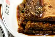 Nokdu (Mung bean) is commonly used in Korean cuisine. Sukju namuls (Mung bean sprouts) are often served as a side dish, blanched and sautéed with sesame oil, garlic, and salt. Ground Nokdu is used to make a porridge called nokdujuk, which is eaten as a nutritional supplement and digestive aid, especially for ill patients.[35] A popular snack, bindaetteok (mung bean pancake), is made with ground nokdu and fresh sukju namul. Starch extracted from ground nokdu is used to make transparent dangmyeon ( cellophane noodles). The dangmyeons are the main ingredients for japchae (a salad-like dish) and sundae (a blood sausage), and are a subsidiary ingredient for soups and stews.[36] The starch can be also used to make jelly-like foods, such as nokdumuk and hwangpomuk. The muk have a bland flavor, so are served seasoned with soy sauce, sesame oil and crumbled seaweed or other seasonings such as tangpyeongchae.[37]