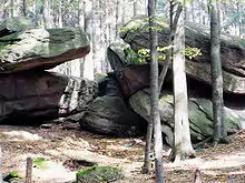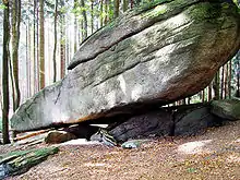 The granite rock outcrop known as Gypsy Rocks (Zigeunerfelsen), a fine example of spheroidal weathering, lies on the western slopes of the Kornberg, on the northern path (Nordweg) from Kirchenlamitz-Ost station to the summit. The largest block is about nine metres long, four to seven metres wide and two metres high; it weighs about 250 tonnes. A rock with the name Wackelstein is a rocking stone and can be made to rock with a wooden beam. The area is believed to have offered hordes of gypsies a refuge in times gone by. During the Thirty Years' War the inhabitants of the area took shelter here.