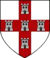 ![]() shield, charge bendy Gules and Argent, helmet, torse and red and white mantling; in crest demi Lion rampant Gules charged with four lilies holding in the paws a Banner of arms Gules flowing to the dexter charged with two cross | |
