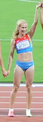 Kristina Savitskaya (Russian: Кристина Савицкая born 10 June 1991) is a Russian track and field athlete. She competed at the 2012 Summer Olympics in the women's heptathlon event.[1] In the 800 m event of the heptathlon, her foot crossed the lane-marking line too early, but this led to a mistaken disqualification of Lilli Schwarzkopf in the neighbouring lane. However, the disqualification was rescinded when Schwarzkopf pointed out the error.[2] Savitskaya's final place was corrected from seventh to eighth.[3]