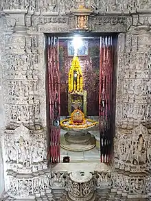 The five Jain temples are close together. The Mahavira temple has an elaborate interior, similar to the Dilwara Jain Temples of Mount Abu, not far away. It dates to 1062. South of it, the Parshvanatha Temple of 1105 is slightly larger and at least as elaborately decorated. To the north are the Shantinatha Temple of 1082, the Neminatha Temple of 1134 (and later), and the smaller Sambhavanatha Temple of 1231.[3]