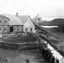 Lækjargata began to take its present form in the late eighteenth century, when two houses were built there. They were built when Reykjavík Cathedral was built on the neighbouring Austurvöllur in 1787. Einar Valdason built a turf farmhouse to the south-east of the cathedral, first called Kirkjuból ('church dwelling') and later Lækjarkot ('stream cottage').[2] Lækjargata was in those days called Heilagsandastræti ('Holy Spirit street'), because one of the houses was inhabited by Bishop Helgi Thordersen and the other by the cathedral priest, Ólafur Pálsson. As the population of Reykjavík grew, the street was extended on the south side of the stream all the way to Tjörnin. Lækjarkot was replaced in 1887 with a wooden house, which became Lækjargata 10a.[3]