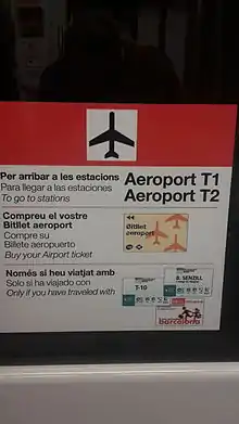 Entering or exiting the metro line from the airport stations in Terminal 1 and Terminal 2 requires a valid ticket. A Single Ticket (Bitllet Senzill), a T-casual (formerly T-10), or a T-familiar are not considered valid, and will not allow exiting the line through these stations. An Airport Ticket at a charge of 5.15 euros can be purchased before exiting the metro. All time-based tickets with unlimited journeys (daily, monthly, quarterly or Hola BCN! tickets) are considered valid, and passengers travelling with them do not need to purchase any additional tickets to access these stations.[12]