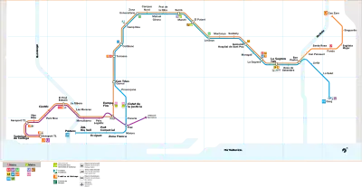 The complete project encompasses an underground line with two branches spanning a large portion of the metropolitan area of Barcelona, crossing Barcelona, Santa Coloma de Gramenet, Badalona, l'Hospitalet de Llobregat and El Prat de Llobregat. Transports Metropolitans de Barcelona is the company operating the line.[2]