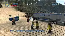 In the overworld, puzzles and collectibles are also hidden,[2] such as timed challenges and car chases.[4] The player is allowed to use any vehicle in the environment to reach their location, including boats, helicopters, and the vehicles of other citizens. Lego studs serve as the game's currency, and can be found in the environment or by solving puzzles. Studs can be used to purchase new vehicles that can be summoned and used at the player's discretion. A rarer form of currency, Lego bricks, often require more difficult platforming or puzzle-solving to collect. Lego bricks are used to complete "superbuilds", which vary in use when completed, such as a structure to summon vehicles or stunt ramps.[3] The Wii U GamePad is used to further progress with multiple features, including scanning for Lego brick locations, taking photo evidence, and listening to private conversations.[3] When these features are not being used, the GamePad displays a map of the environment.[4] The 2017 re-release of the game added local multiplayer.[1][5][6]