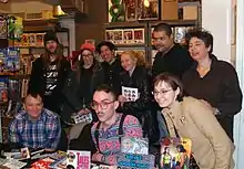 Frank Margerin's most famous strips follow the lives of working class heterosexual men centered around the character of "suburban rocker" Lucien, and occasionally feature LGBT themes that show the characters' assumptions of stereotypes.[140] In Votez Rocky, the characters dress as the Village People and when a stereotypically gay character tries to chat-up Lucien in Le Retour (1993), he remains oblivious to the attempt. These occurrences have been noted to be about reaffirming their masculinity by comparison with non-masculine gay stereotypes, rather than depictions of homophobia.[141] The relationship between social class and sexual orientation is also explored when a character is arrested by vice police in a park along with a number of gay couples and is humiliated by the police officers homophobic insults.[142] In Comme s'il en Pleuvait (2001), the same character finds that the assumption that he is gay, due to a close male friendship, is to his benefit when in fashionable literary groups, where he is seen as more interesting and trendy.[143]