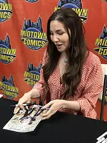 In 1997, writer Ivan Velez, Jr., who had previously written for the adult underground Gay Comix, reintroduced Jennifer Kale with a closely cropped "butch" haircut in the pages of Ghost Rider, portrayed her as related to both Johnny Blaze and Daniel Ketch, and said that an issue of Howard the Duck had shown Jennifer and Doctor Strange as those who initially brought Howard to Earth-616 (no such issue of Howard the Duck exists, and Jennifer and Doctor Strange did not meet until Man-Thing (vol. 2) #4 (May 1980)), after Howard's series had concluded).[94] In issue #92 (January 1998), he depicted Ketch having a vision of life without Ghost Rider in which Jennifer had been in a relationship with a woman, Marie, for three years. Jennifer's first boyfriend, Jaxon, was shown in Fear #13 (April 1973) and #18 (November 1973) and Man-Thing (vol. 2) #4 (May 1980), by which point they had broken up over Jennifer's sorcery. She was shown sharing a bed with a chubby boyfriend named Bernard Drabble in The Legion of Night (October 1991), which was written by her creator, Steve Gerber (later writer of the GLAAD Award-nominated Hard Time), who thought making her related to both Ghost Riders was bad writing, saying that Marvel should change its name to DC for "Deliverance Comics" for being so inbred (he did not read the issues in question, nor was he told of Jennifer's newfound lesbianism).[95] In Witches, Brian Patrick Walsh presents her with the attitude that having slept with women makes her a "bad girl" as a direct character foil to Topaz as a "good girl" (which does not match earlier portrayals of Topaz), and Satana as "the ugly."[96] In Marvel Zombies 4, Topaz teasingly calls Jennifer "girlfriend" to be ironic.[97] Her entry in the Official Handbook of the Marvel Universe now states that she is bisexual.[98]