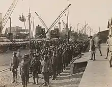 In the British Army during the First World War, labour or pioneer battalions were initially formed in December 1914 from recruits with skilled trades or experience in manual labour, trained to fight as infantry but usually used to build trenches and carry out other manual labour. Early in 1916 these began to also include men not assessed as fit enough to fight to carry out a similar role and were sometimes also known as Infantry Works Battalions. Initially assigned to individual regiments, the existing Labour and Infantry Works battalions were grouped together in February 1917 to form the new Labour Corps.[1][2]