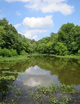 Lake Chesdin Reservoir was created in 1968 by construction of the George F. Brasfield Dam on the Appomattox River.[2] Lake Chesdin was built to supply water to Dinwiddie, Prince George and Chesterfield counties, along with the cities of Colonial Heights and Petersburg.[3] In the fall of 1960, these five municipal governments in the Petersburg tri-cities area came together to pass an ordinance establishing the Appomattox River Water Authority (ARWA).[4] Once the dam project was completed in 1967, the river's flow filled the pool behind it to create Lake Chesdin.[4]