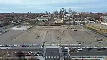 Lake Street looking east from Nicollet Ave with Interstate 35W in the foreground and the Midtown Exchange visible in the background.