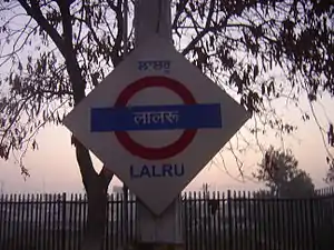 Lalru railway station is a railway station in Sahibzada Ajit Singh Nagar district in the Indian state of Punjab on the Northern Railways network. Its code is LLU. It serves Lalru town. The station consists of two platforms. The platforms are not well sheltered. It lacks many facilities, including water and sanitation. It is a small station which is visited by about seven passenger trains.[1]