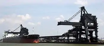 Lambert's Point is the home of Norfolk Southern's Pier 6, the largest and fastest transloading facility for coal in the Northern Hemisphere. The facility's annual throughput capacity is rated at 48 million tons.[3] Unlike most facilities of its kind, Lambert's Point assembles all cargo in railcars and loads direct to vessel, rather than utilizing ground storage. The system is remarkably versatile due to its ability to blend individual lots up to five ways (a five-track blend), yet in increments as small as 100 tons. The 1850 pier has three berths, two for loading and a third which acts as a layberth, as well as two shiploaders. The facility can accommodate approximately 6,200 loaded railcars, and at full capacity, its dual twin rotary dumpers (capable of dumping up to four cars simultaneously) can dump 1,200 cars per day.