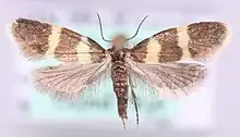 The wingspan is 9-11.5 mm. The forewings are brown with a purple and yellowish sheen and two pale yellow transverse bands.[2] Adults are on wing in May and June.