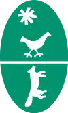 The park's unique emblem is derived from a woodcut, still visible today, made on the beam of an old building in Luxey. The scene depicts a leaping fox frustrated in its hunt: a solid horizontal line separates him from the hen who strolls serenely in the sun. The situation was a familiar one in the Gascony moors where generations of farmers built their livestock shelters on stilts.[8]