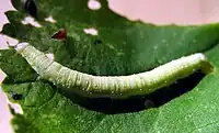 The wingspan is 36โ40 mm. Forewings are fawn colour with a browner basal patch, median band and distal shade, all finely and delicately white-edged distally, the median band also accompanied by a fine white line proximally, sharply indented on the submedian fold and more shallowly in the cell. Hindwing pale, becoming browner at the distal margin.[1] The larva is long and slender, monochrome bright yellow-green.