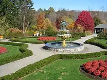 • William and Mildred Lasdon Memorial Garden (0.4 ha / 1 acre) - an entrance court with a fragrance garden; a formal garden with boxwood hedges, heather, flowering annuals and bulbs, and a central fountain; and a synoptic garden featuring hundreds of shrubs whose names represent every letter in the alphabet, from "A" (Abelia) through "Z" (Zenobia).