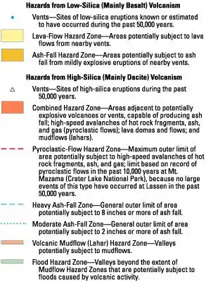 The areas of highest hazard are those that could be affected by pyroclastic flows and lahars. These areas, including Hat Creek Valley, are those in the immediate vicinity and downhill from likely eruption sites. Fallout of ash will affect areas downwind at the time of an eruption. Within the hazard zones, relative hazard is gradational, decreasing away from the location of potential vents.[4]