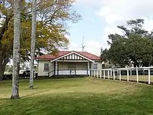 After much effort, funds were eventually raised to begin the construction of a clubhouse to the design of architect Matthew C Williamson. In October 1937 Williamson advertised a tender in the Architectural and Builders Journal of Queensland for "a croquet clubhouse at Toowoomba".[38] Further fundraising through events such as bridge nights, as well as generous donations from patrons, enabled the club to complete the construction of the clubhouse.[32] When completed in 1938, the new clubhouse was described as "a compact, cream-painted building, finished with touches of brown … it stands in a picturesque setting on green lawns, shade trees and flowering shrubs".[32] The official opening on 7 May 1938 was attended by Mayor Annand, state ministers and aldermen, as well as Stephens and Williamson. Timber seats around the lawns had been built by 1936 and the creepers to shade the seats also planted that year. Timber fences surrounding both lawns were complete by 1939.[39][1]