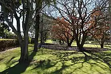 Within the park are numerous horticulturally important cold climate trees Stephens imported from other countries. Several of these have been identified in the National Trust of Australia's Significant Tree Register; an Oak (Lithocarpus spp), Mori Oak (Quercus morii), a Bristle-toothed Oak (Quercus acutissima), an English Oak (Quercus robur), and an avenue of Chilean Wine Palms (Jubaea chilensis). All of these trees are identified as regionally important.[66] Laurel Bank Park is also listed on the Australian Government's Directory of Australian Botanic Gardens, along with Toowoomba's Queens Park and Botanic Gardens.[67][1]