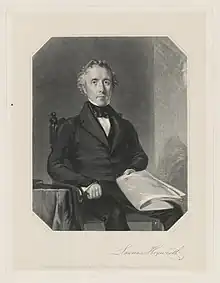Having opposed the imposition of export duties as early as 1815, when the British government had announced its intention to impose a tariff on goods sent to Rio de Janeiro,[14] Heyworth became a supporter of the Anti-Corn Law League.[15] By the late 1830s, he had become a prominent figure in the free trade movement of northwest England, being both chairman of and the largest donor to the Liverpool Free Trades Association.[16] He had by this time also become involved in the campaign for repeal of the Corporation and other Test Acts.[16] He was an early supporter of the Complete Suffrage Union (CSU), along with fellow Radicals such as Edward Miall and John Bright.[17] Although sharing similar aims to Chartism, Heyworth was among those CSU members who were influenced by Joseph Sturge and objected to the methods of Chartist leaders such as Feargus O'Connor.[18] The influence of Sturge also played a part in his support for the abolition of slavery and his membership of a peace movement called the League of Universal Brotherhood, founded by Elihu Burritt in 1848.[19] Together with Joshua Walmsley, he founded the Financial Reform Association in the same year.[20]