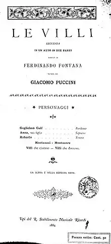 Le Villi (The Willis or The Fairies) is an opera–ballet in two acts (originally one) composed by Giacomo Puccini to an Italian libretto by Ferdinando Fontana, based on the short story "Les Willis" by Jean-Baptiste Alphonse Karr. Karr's story was in turn based in the Central European legend of the Vila, also used in the ballet Giselle. The opera, in its original one-act version, premiered at Milan's Teatro Dal Verme, on 31 May 1884.[lower-alpha 1]