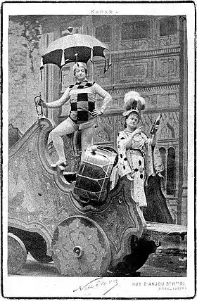 No expense had been spared on the scenery – the 24 majestic sets by Cornil, Fromont and Chéret replicated places (such as the Observatory of Paris, a high-furnace, a lunar passage or a volcano) and created original architectural conceits (such as a glass palace or mother-of-pearl galleries). The use of "trucs", trap-doors and artifices accentuated the surprise-effects on the spectators. The producers even borrowed a dromedary from the Jardin d'Acclimatation. The 673 costumes were designed by Alfred Grévin, and the two ballets choreographed by M. Justament. The principal roles were taken by Zulma Bouffar (in the principal boy role of Prince Caprice – reviews stated she "sang with esprit and acted with intelligence and finesse"[6]), Christian (Vlan), Pierre Grivot (Microscope), Tissier (Cosmos) et Mlle Marcus (Fantasia). At the première, the Ronde des Charlatans, interpreted by Zulma Bouffar and Christian, won an encore.[7] The front of the theatre had a large model of the Moon to advertise the new opera.[8]