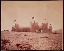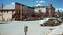 Leadville was founded in 1877 by mine owners Horace Tabor and August Meyer at the start of the Colorado Silver Boom. Tabor's house was also built in 1877, at 116 E. 5th Street.[18] The town was built on desolate flat land below the tree line. The first miners lived in a rough tented camp near the silver deposits in California Gulch.[19] Initially, the settlement was called "Slabtown", but when the residents petitioned for a post office, the name "Leadville" was chosen. By 1880, Tabor and Meyer's new town had gas lighting, water mains, 28 miles (45 km) of streets, five churches, three hospitals, six banks, and a school for 1,100 students. Many business buildings were constructed with bricks hauled in by wagons.[20]