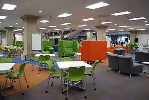 Learning commons, also known as scholars' commons, information commons or digital commons, are learning spaces,[1][2] similar to libraries and classrooms that share space for information technology, remote or online education, tutoring,[3][4] collaboration, content creation, meetings, socialization, playing games and studying.[5][6] Learning commons are increasingly popular in academic and research libraries, and some public and school libraries have now adopted the model.[7] Architecture, furnishings and physical organization are particularly important to the character of a learning commons, as spaces are often designed to be rearranged by users according to their needs.[8]