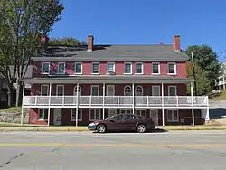The Lehoullier Building is located on the west side of Main Street, at its junction with Fayette Street. It is a brick building with a gabled roof and five irregularly placed chimneys. It is set on a sloping lot, presenting three stories to Main Street and two to the rear. It is nine bays wide, representing an original division into three separate townhouse-style units. Each unit has since been further subdivided into two units, for a total of six. The ground floor of each section has a center entrance flanked by paired sash windows. The second-floor units, accessed by a two-story porch, have entrances in either the left or right bay. A hip roof covers the porch, and there are smaller sash windows in the third floor bays.[2]
