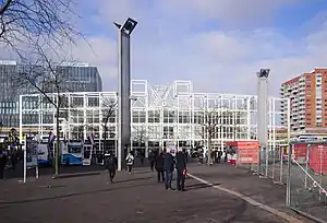 The fourth, and current, station was designed by Harry Reijnders and completed in 1996. Consisting of a white lattice structure, a curved, shell-like entrance leads into a ticketing hall lined with shops and restaurants. When first built, the floor had a bright blue and white finish. Problems with passengers slipping required that the floor be replaced with standard tiling.