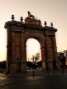 This arch (Arco de la Calzada de los Héroes, in Spanish), topped by a bronze lion, began construction in 1896 and has been modified a number of times since then. The first lion was added in 1943 by Francisco Lozornio Castillo made of bricks and mortar. This was replaced by the bronze one in 1958. The idea for a bronze lion was that of the matador Antonio Velázquez, a native of Leon, whose bravery in the ring earned him the nickname of the "Heart of Leon" ("Corazón de León", in Spanish).[26] Not long before his death in 1959, he complained that the brick lion should be replaced with a better work of art, causing something of a commotion in the Leon community. This caught the attention of sculptor Humberto Peraza Ojeda who made the one that sits atop the arch today.[26]