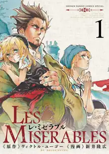 Based on Victor Hugo's novel of the same name, Takahiro Arai's Les Misérables manga adaptation was serialized in Shogakukan's shōnen manga magazine Monthly Shōnen Sunday from September 12, 2013,[2][3] to May 12, 2016.[4] Shogakukan collected its chapters in eight tankōbon volumes, released from December 12, 2013,[5] to July 12, 2016.[6]