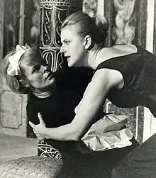A 2013 Sydney Theatre Company production, adapted by Andrew Upton and directed by Benedict Andrews, starred Cate Blanchett as Claire, Isabelle Huppert as Solange, and Elizabeth Debicki as the Mistress.[11][12] The production was shown as part of the Lincoln Center Festival in August 2014 at New York City Center.[13] Andrews employed contemporary devices that combined theatre with film in his use of video cameras, stylized choreography, popular “underground” music soundtracks,[14] liberal use of profanity, and cultural modernization such as off handed comments from the Mistress on her dresses: "McQueen designed it for me."[15]