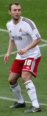 Kelly signed a three-and-a-half-year contract with Bristol City in January 2013, moving for an undisclosed fee.[29] The manager who signed him, Derek McInnes, was sacked just two days later following Kelly's debut, a 4–0 home defeat to Leicester City.[30][31] Kelly made 19 appearances for Bristol City in the 2012–13 season, but then suffered a cruciate ligament injury in July 2013.[32] As a result of this injury, Kelly only made two appearances during the 2013–14 season.