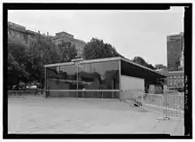 Almost from the start of its stewardship, the Park Service sought to move the bell from Independence Hall to a structure where it would be easier to care for the bell and accommodate visitors. The first such proposal was withdrawn in 1958, after considerable public protest.[76] The Park Service tried again as part of the planning for the 1976 United States Bicentennial. The Independence National Historical Park Advisory Committee proposed in 1969 that the bell be moved out of Independence Hall, as the building could not accommodate the millions expected to visit Philadelphia for the Bicentennial.[77] In 1972, the Park Service announced plans to build a large glass tower for the bell at the new visitors center at South Third Street and Chestnut Street, two blocks east of Independence Hall, at a cost of $5 million, but citizens again protested the move. Instead, in 1973, the Park Service proposed to build a smaller glass pavilion for the bell at the north end of Independence Mall, between Arch and Race streets. Philadelphia Mayor Frank Rizzo agreed with the pavilion idea, but proposed that the pavilion be built across Chestnut Street from Independence Hall, which the state feared would destroy the view of the historic building from the mall area.[78] Rizzo's view prevailed, and the bell was moved to a glass-and-steel Liberty Bell Pavilion, about 200 yards (180 m) from its old home at Independence Hall, as the Bicentennial year began.[79]