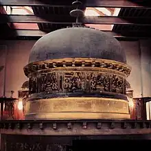 In East Asia this subject became popular by itself, the most famous and one of the earliest at the Todaiji in Nara, Japan.[30] Buddha's first bath is also sometimes shown in the same scene; two Nagaraja (Nāga kings) perform the bathing, and maids may attend.[31] Symbolic re-enactments of this form part of the rituals celebrating Buddha's birthday or Vesak in many countries.[32]