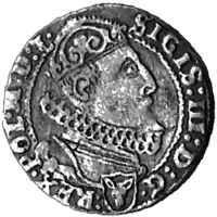 "Szóstak" (coin) with King Sigismund III Vasa and the coat of arms of Treasurer Hermolaus Ligęza (1626)