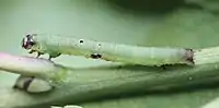 Larvae are moderately stout, bright green with red dorsal spots, a red lateral blotch on the 1st—2nd abdominals and red marks on claspers; a rare variety is grey-brown. The pupae are red-brown with blackish wings.