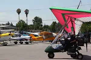 Three types of light sport aircraft. In the foreground, an E-LSA Antares USA Ranger weight-shift control trike. In the background, an S-LSA Evektor SportStar and an L-LSA Zlin Aviation Savage Cub.