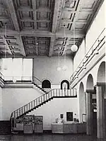 Behind the entrance on the north-western corner is a small vestibule. To the right of the latter is a large sculpture hall leading to two large galleries with skylights intended for paintings, flanked by series of smaller exhibition spaces. The eastern end of the building has a large-scale portico facing a small park surrounded by the large windows of a small restaurant.[1]