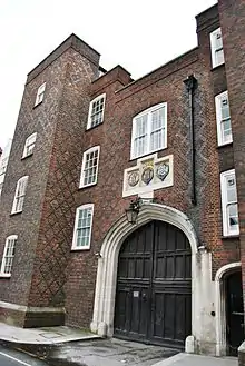 The Gatehouse from Chancery Lane is the oldest existing part of the Inn, and was built between 1518 and 1521.[49] The Gatehouse was mainly built thanks to the efforts of Sir Thomas Lovell, the Treasurer at the time, who provided at least a third of the funds and oversaw the construction itself—as a result, his coat of arms hang on the gate, along with those of the Earl of Lincoln and Henry VIII (the king at the time).[50]