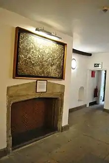 The Old Hall dates from at least 1489, when it replaced the smaller "bishops hall". The Old Hall is 71 feet long and 32 feet wide, although little remains of the original size and shape; it was significantly altered in 1625, 1652, 1706 and 1819.[32] A former librarian reported that it was "extensively remodelled" by Francis Bernasconi in 1800. This remodelling led to the covering of the oak beams with a curved plaster ceiling, "a most barbarous innovation".[32] The weight of the plaster created the risk that the roof would collapse, and between 1924 and 1927 Sir John Simpson dismantled the entire hall, straightening warped timbers, removing the plaster, replacing any unserviceable sections and then putting the entire hall back together. It was reopened on 22 November 1928 by Queen Mary.[33]