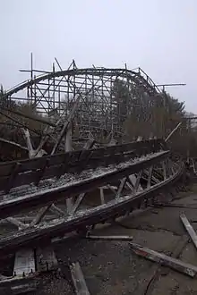 The abandoned park suffered a string of fires after its closing, a total of six as of May 2012. For years the only remaining structures in the park were some badly damaged food buildings and the roller coaster. The coaster's high starting "lift hill" collapsed during a heavy January 2005 snowstorm (Jan 22-26), the roof of the platform collapsed in May 2008 and much of the rear (southern) curve collapsed, probably due to water damage, around mid-May 2009. Two of the remaining buildings near the roller coaster partially collapsed in early 2008, both buildings collapsed by early 2010. The remainder of the roller coaster that was left standing was demolished on July 11, 2012.[1]