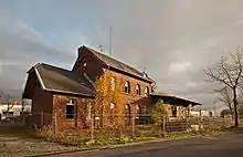 The refurbished station building now serves as a physiotherapist’s practice. There is a temporary signal box at the junction to the chemical park. In the station area, there used to be a loop around the station, a dead-end track and two connecting tracks to the former Akzo works. Two fireless locomotives were available on these for shunting and the hauling of wagons from the station to the works site, even after the turn of the millennium. Parallel to the track, a headshunt runs to about km 9.8, which is shortly before the Kamperstraße level crossing. All traffic from there towards Heinsberg was discontinued on 28 May 1994.[22]