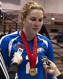 ![]() Lisa Barclay being interviewed after leading the UBC Thunderbirds to the 2012 CIS (now U SPORTS) Women's Volleyball Championship title in Hamilton, Ontario. | |||||
